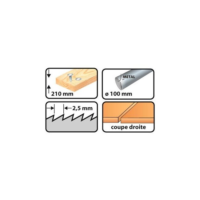 Lame de scie sabre 210 mm fraisée avoyée. Coupe droite pour réparation de palettes, bois avec clous/métal, tôles métalliques, tuyaux, profilés en aluminium, coupe à ras (lame flexible), d'une épaisseur maximale de 210 mm.